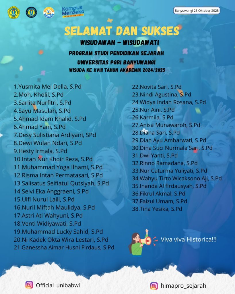 Banyuwangi, 25 Oktober 2025 – Sebanyak 38 mahasiswa Program Studi Pendidikan Sejarah Universitas PGRI Banyuwangi resmi mengikuti prosesi wisuda tahun akademik 2024/2025 yang digelar di Hotel El Royal Banyuwangi. Dari jumlah tersebut, Novitasari mencatat prestasi gemilang dengan meraih IPK tertinggi 3,84 dan dinyatakan lulus dengan predikat Kumulatif (Cum Laude). Sementara IPK terendah dari wisudawan prodi ini tercatat 3,50.